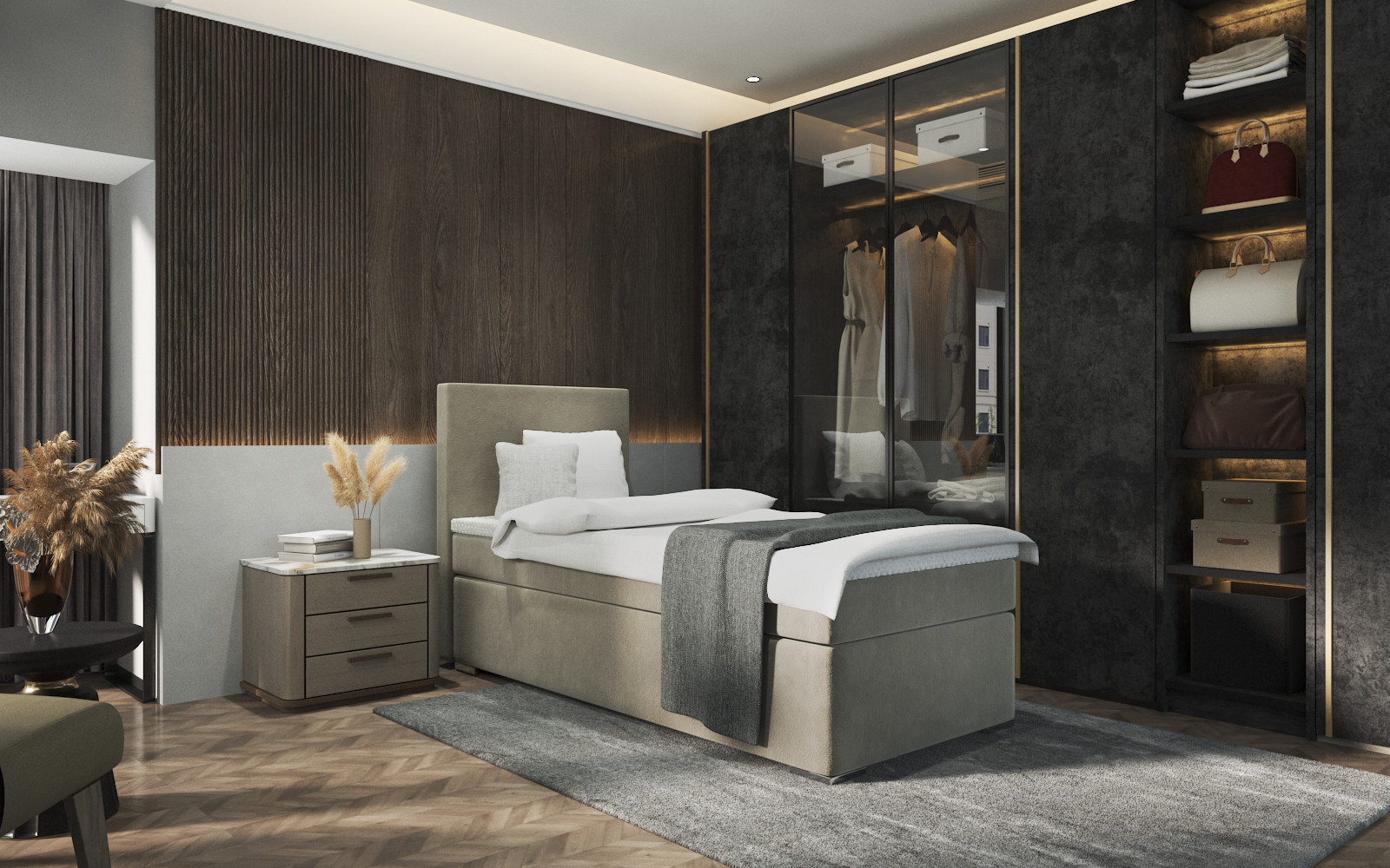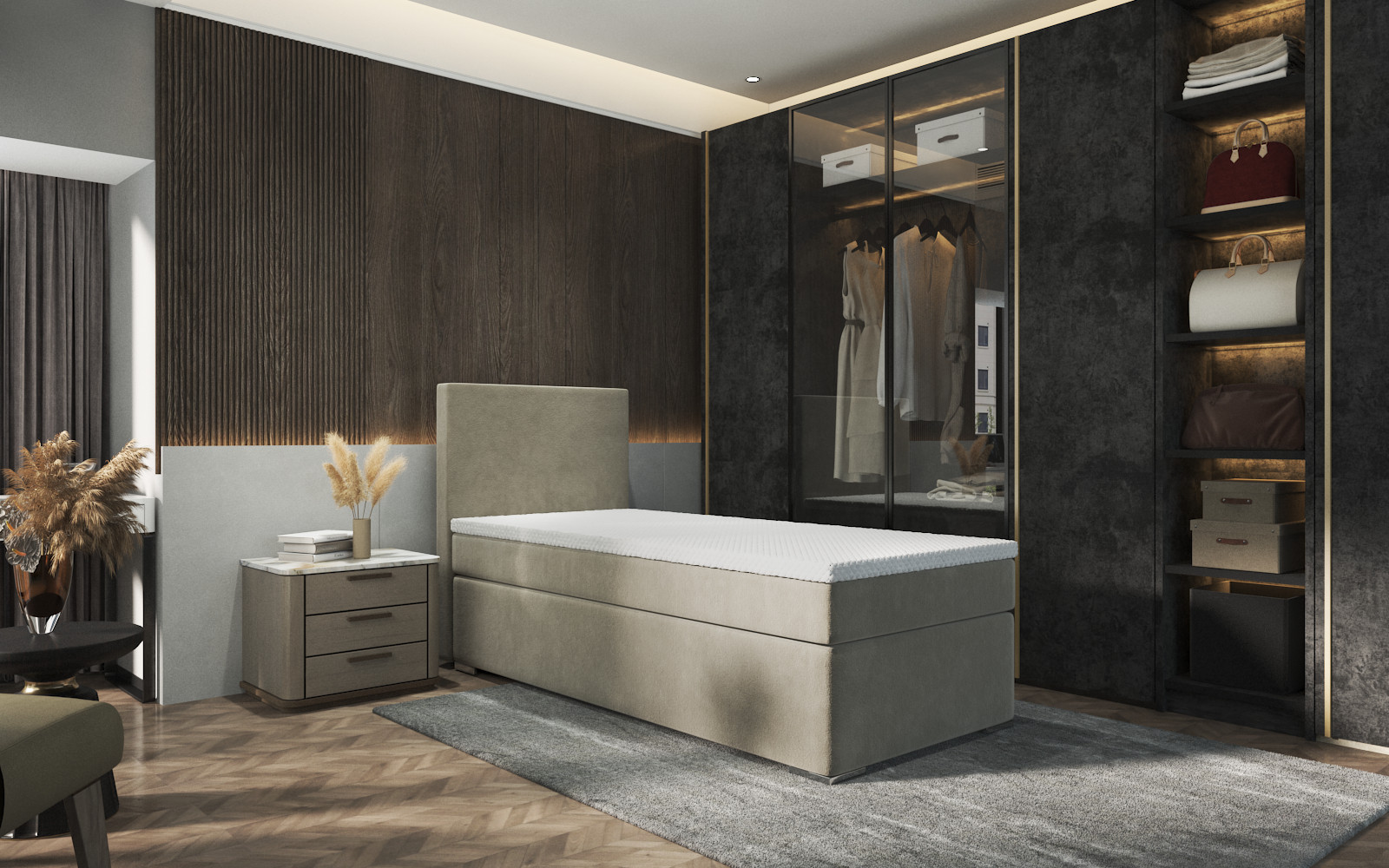 Nowoczesne łóżko do sypialni, wykonane z trwałych materiałów, z dbałością o szczegóły. Możliwość wyboru w różnych tkaninach sprawia, że można je dopasować do każdego wnętrza.
